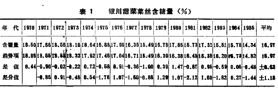 菜絲含糖量的年際變化從銀川糖廠1970~1985年菜絲含糖量的資料看,有兩個特點:是利用正交多項式,計算含糖量的趨勢變化(見表1)有個連續下降的趨勢。含搪量1970~1976年在17%以上,1977~1953年下降到16%,1954年下降到16%以下,1985年下降到15%以下。從1978年的18.50%到1985年的14.34%,含塘量前后共下降了4.16%。這種下降趨勢,主要反映了甜菜品種的退化和生產管理水平的降低,如大量施用氮肥,以及甜菜面積的不斷擴大。二是年際間還出現了高低變化。這種變化很大程度上是因為氣象條件的變化所引起的,因此稱這個變量為氣候含糟里,從表1可見,除1978年外,般表現為高低約兩年周期。