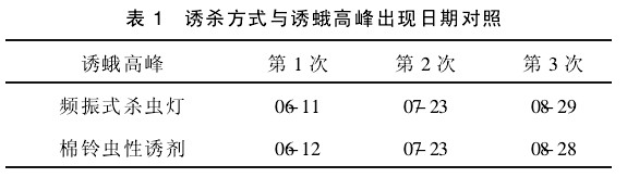 表1可見這兩種方式的誘蛾高峰日期基本一致,說明太陽能殺蟲燈用于害蟲發(fā)生動態(tài)的監(jiān)測是可行的,可為生產(chǎn)提供及時準(zhǔn)確的防治依據(jù)。
