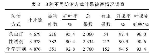 試驗園與對照園分別與6月20日與9月5日隨機選取5棵樹,每棵樹在不同方位選5個小枝,調(diào)查葉果被害情況并記錄。